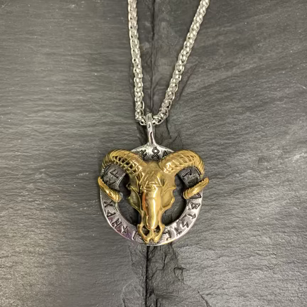 Hell Rose: Necklace in stainless steel/stainless steel 316L titanium in gold and silver metal, with pike head Baphomet in Viking style. The pike has its horns around a round amulet ring and the ring is engraved with rune writing and on its head is also engraved Odin's symbol Valknut mark. The pendant measures from where the pendant starts 45x38mm and the thickness of the chain is 4mm and length of the chain measures 60cm and both are in the best quality stainless steel 316L. There is a good weight in both chain and pendant of 0.55 grams.
