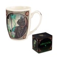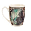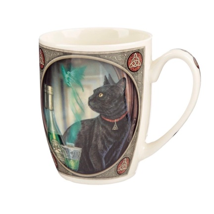 lisa Parker - Absinthe Cat Porcelain Mug A glass of absinthe has been poured and on an ornate dressing table sits a familiar black cat with a red collar around its neck, adorned with a small twisted silver triquetra. Next to the cat is a small Pontellier glass, half filled with the infamous green liquid, absinthe. A small absinthe spoon sits on top of the glass with a sugar cube waiting to be dipped into the liquid. The black cat sits perfectly still, mesmerized by the green fairy floating from the glass. The beautiful embossed details enhance the magic and create a striking 3D effect, while the large space makes it a wonderfully practical item.