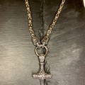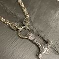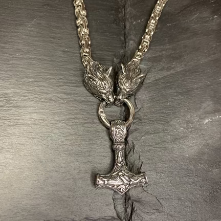Mjølner – Tors HammerVedhænget i midten er Mjølner, Thors legendariske hammer. Den er det ultimative symbol på beskyttelse, styrke og retfærdighed i nordisk mytologi.Dette smykke forener to af de mest ikoniske elementer fra den nordiske mytologi og er en hyldest til styrke, loyalitet og gudernes beskyttelse. Bær en kraftfuld kombination af nordisk mytologi med denne exceptionelle halskæde. Designet fanger essensen af vikingetidens styrke, hvor to detaljerede ulvehoveder holder en ring i munden, hvori Thors mægtige hammer, Mjølner, hænger som vedhæng.